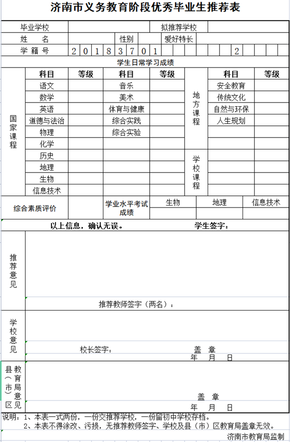 具备上述条件的均可根据本人意愿,填写《济南市初中优秀毕业生推荐申请表》,并经初中学校两名初三任课教师联名推荐,学校审查同意。